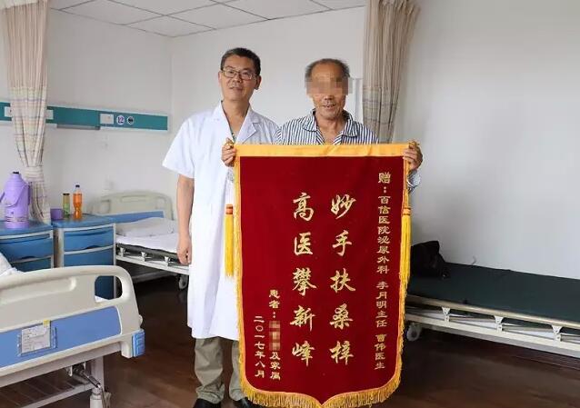 其他描述:患先天性左肾缺失,十二年前因右输尿管狭窄前往北京301医院行输尿管手术探查,放置右输尿管DJ管,至今十二年,长期的输尿管引流,使老人经常伴发尿路感染等症状。先后多次于白求恩医院就诊治疗。两个月前的一次输尿管置换术后,老人就一直伴随右腰背部胀痛,于是在17日来到天津市某三甲医院行输尿管内支架DJ管置换术,结果由于术后引流不畅,右肾重度积水未缓解引发急性肾功能不全。经多方打听,遂到百信医院就诊。入院时近凌晨1点钟,老人体温升高,血尿升血,右侧腹痛、腰痛。而且此时老人恶心呕吐,精神、睡眠、食欲都很差。检查结果显示:肌酐、尿素指标已经超出正常值数倍,出现严重肾功能不全。李月明主任决定立刻为老人进行急诊手术,对其右肾进行穿刺造瘘术,引出900ml脓尿。术后,老人恢复良好,第二天下地活动,特制锦旗以表感激。